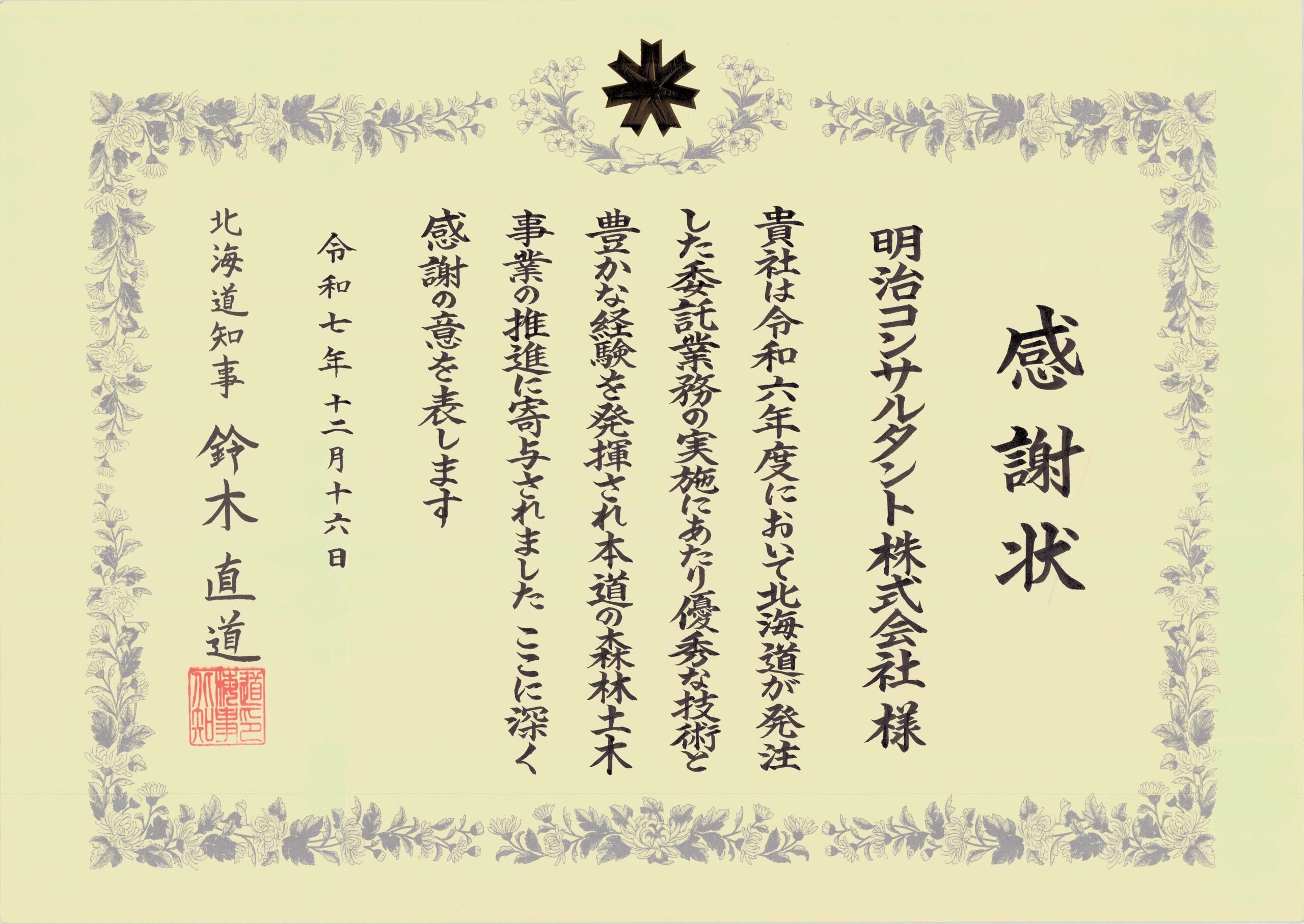 令和7年12月16日、弊社では北海道水産林務部より、森林土木事業の委託部門において、優秀業者として感謝状を授与されました。